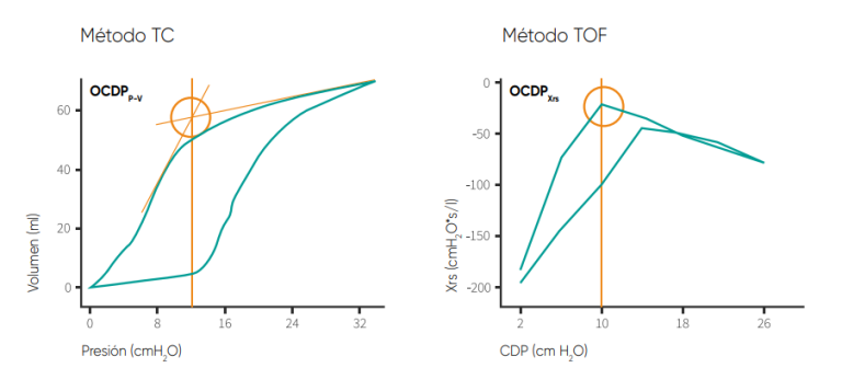 TOF permite a los médicos evaluar la presión óptima de las vías aéreas midiendo la reactancia Xrs del sistema respiratorio, y personaliza el soporte de ventilación HFOV o CMV al paciente individual.