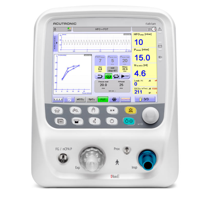La técnica patentada de oscilación forzada (TOF) es un método no invasivo, seguro y sencillo que permite al médico evaluar un pulmón reclutado óptimamente. Durante una maniobra de reclutamiento, TOF determina la reactancia óptima Xrs enviando una oscilación de presión pequeña y bien definida en la abertura de la vía aérea, y posteriormente mide la respuesta de flujo del sistema respiratorio. La reactancia Xrs es una medida muy precisa de la reacción del pulmón al pulso de presión. Si se ajusta el nivel óptimo de CPAP, PEEP y MAP para el paciente individual, TOF reduce drásticamente el estrés mecánico en los pulmones y reduce los costes de ventilación.